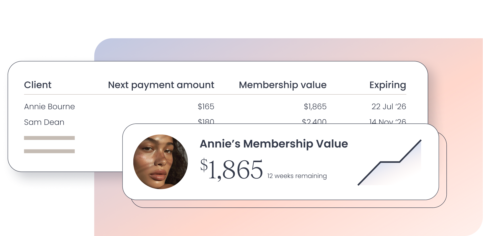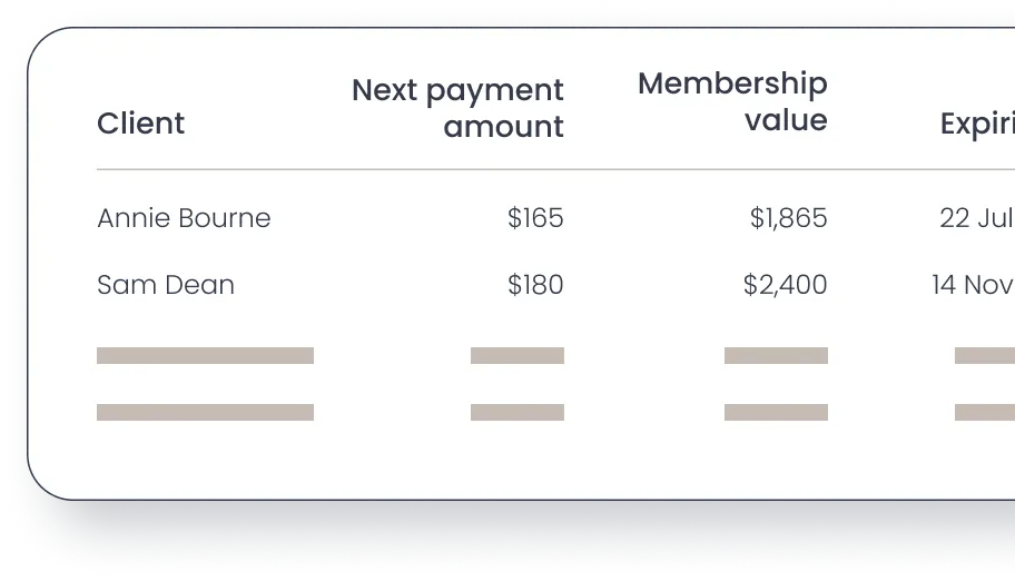 Dashboard shows contracted revenue, who's paying, who's expiring, and exactly what's hitting your bank account. After each appointment, just ask "does the same time next month work?" – they're already committed.